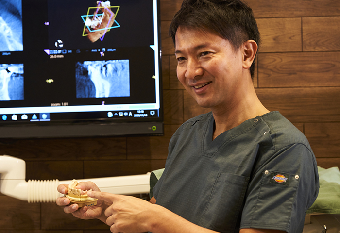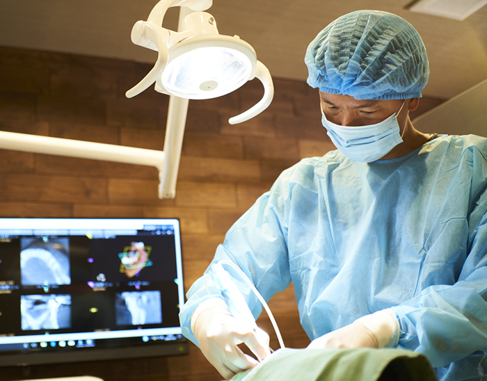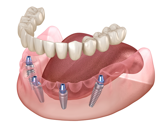 オールオン4(All-on-4)は、インプラントの埋入本数が少なく済むこと等から事前の綿密な計画のもと抜歯からインプラントの仮歯の装着までを1日で行うことが可能な治療です。※1 個々の患者様の状態にもよりますが、歯を支えるあごの骨の状態によっては当日に固定式の仮歯を入れられないこともございます。その場合は入れ歯にて対応させて頂きます。