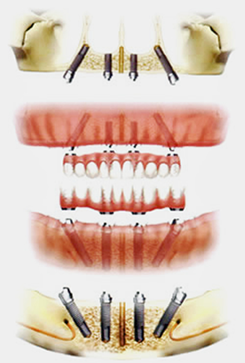 オールオン4は高度な技術が求められるほか、CTを用いたコンピューターシュミレーションベースによる細かい診断と治療技術、術後の経過観測などが重要となります。従来、すべての歯を失った方にインプラント治療を行う場合、骨の移植をしたり、6~10本のインプラントを埋め込むのが一般的でした。