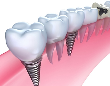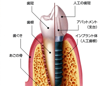 インプラントとは、顎の骨に人工歯根となる金属を埋め込み、その金属を土台にして、 天然の歯と同じような人工の歯を取り付ける治療方法です。埋め込む金属に生体との親和性が高いチタンを使うことが多く、チタンは長年の臨床研究でインプラントの素材として最も安全であり、また顎の骨としっかり結合することが確認されています。