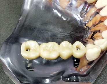 歯冠の部分の咬む面からインプラントに対して小さなねじを埋めて留める方法です。上から見たときにネジが見えますが、これは白い詰め物で隠す事が出来ます。最大の特徴は取り外しが出来ることです。人によってはかみ締めなどにより磨り減ったり、もしくは割れてしまうこともあります。その場合取り外しが出来ると歯冠の部分だけを修理することが出来ます。