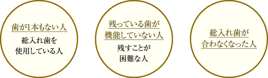 オールオン4とは、上下それぞれにつき、最少4本のインプラントを埋入して、そのインプラントで総入れ歯の形をした上部構造を固定し、速やかに見た目と噛み合わせ機能を回復する治療法です。長い間、歯がない状態で過ごしていると、歯を支える骨がなくなっていき、通常のインプラント治療が難しくなります。そんな状態でも、傾斜埋入という技術で、斜めにインプラントを埋入してしっかりと上部構造を固定することができるため、幅広い患者様の状態に適用することができます。